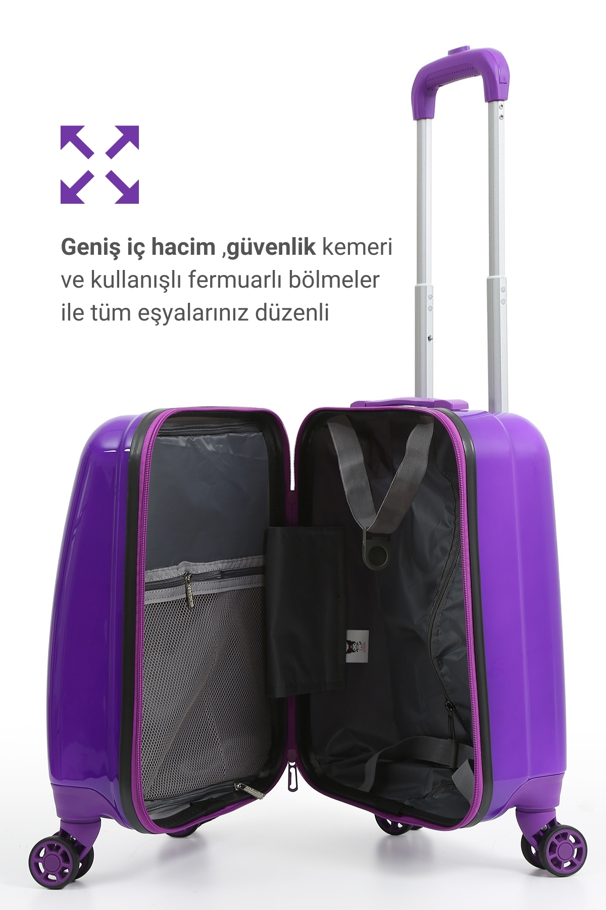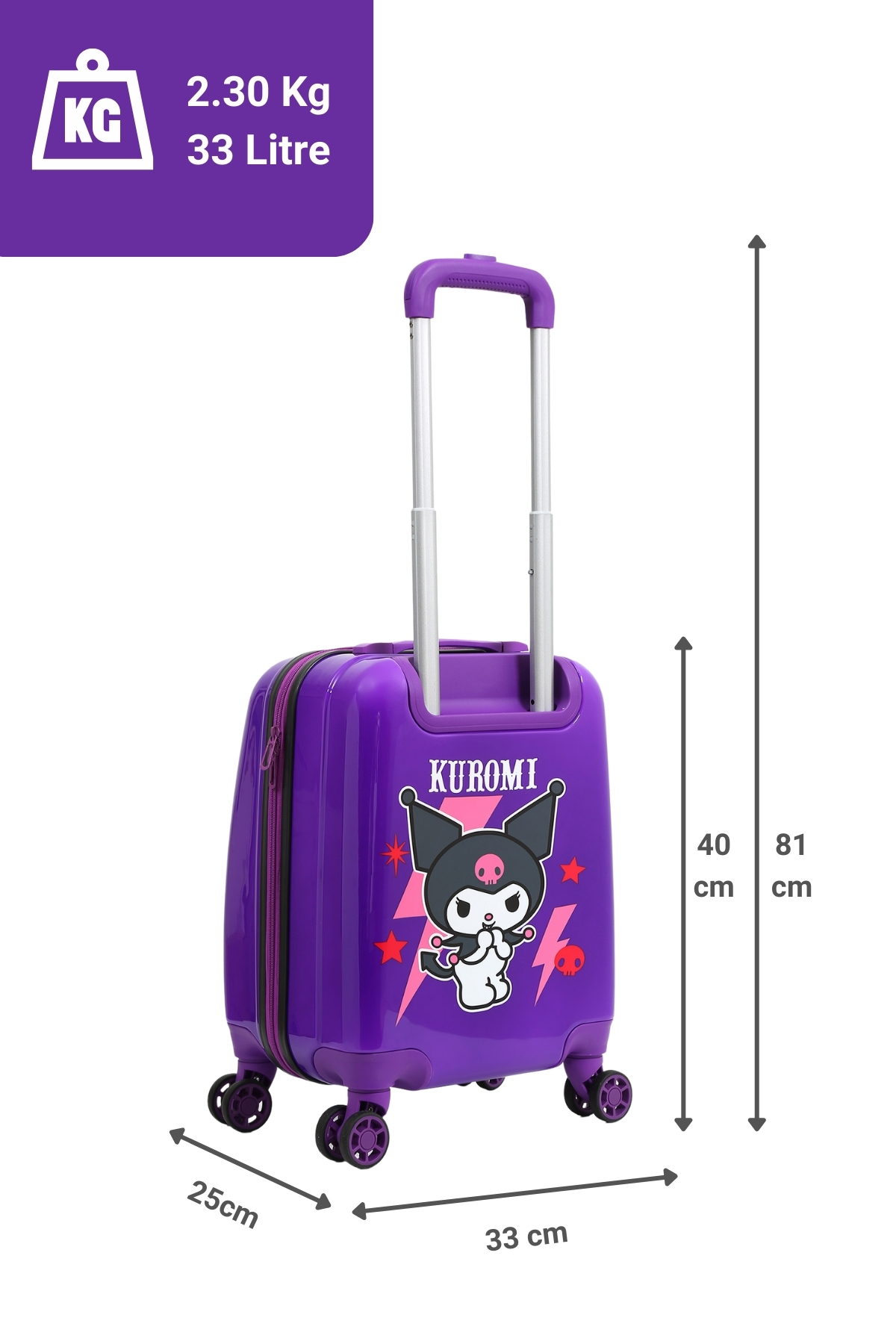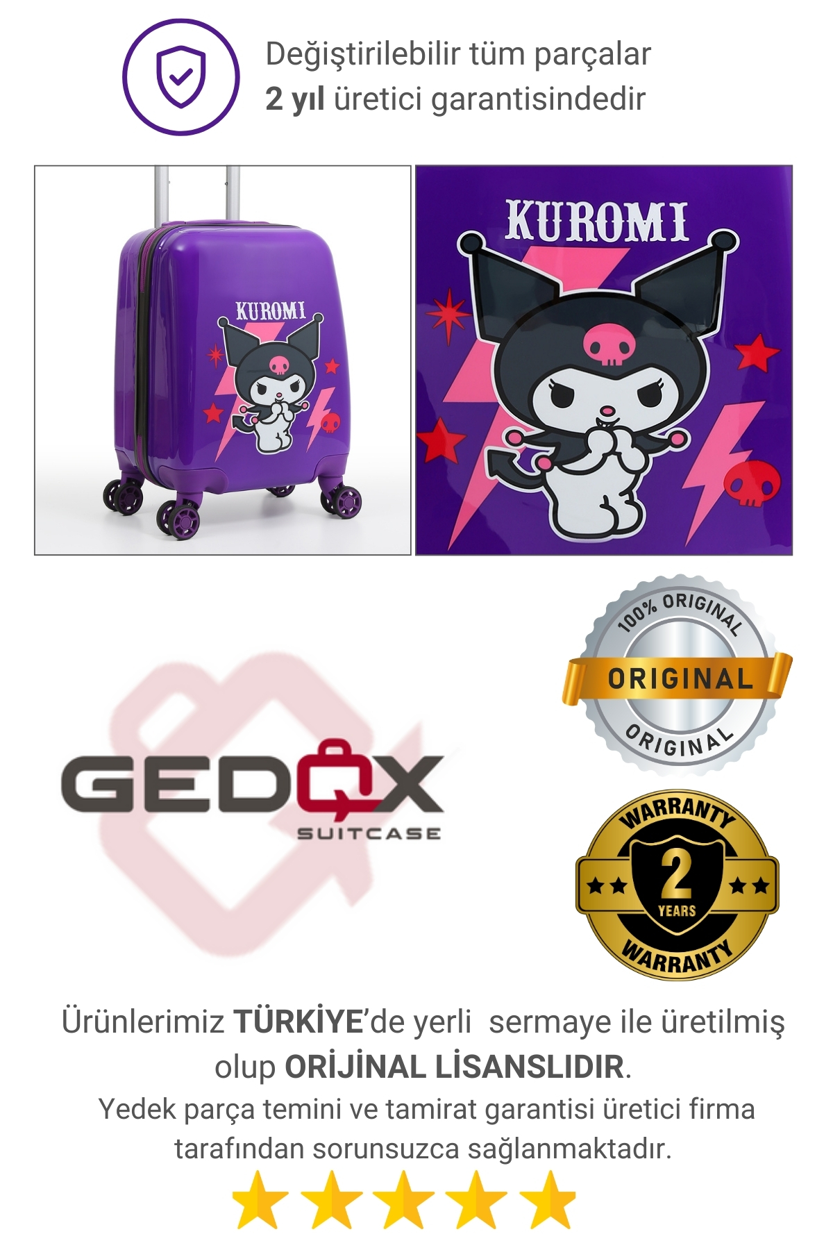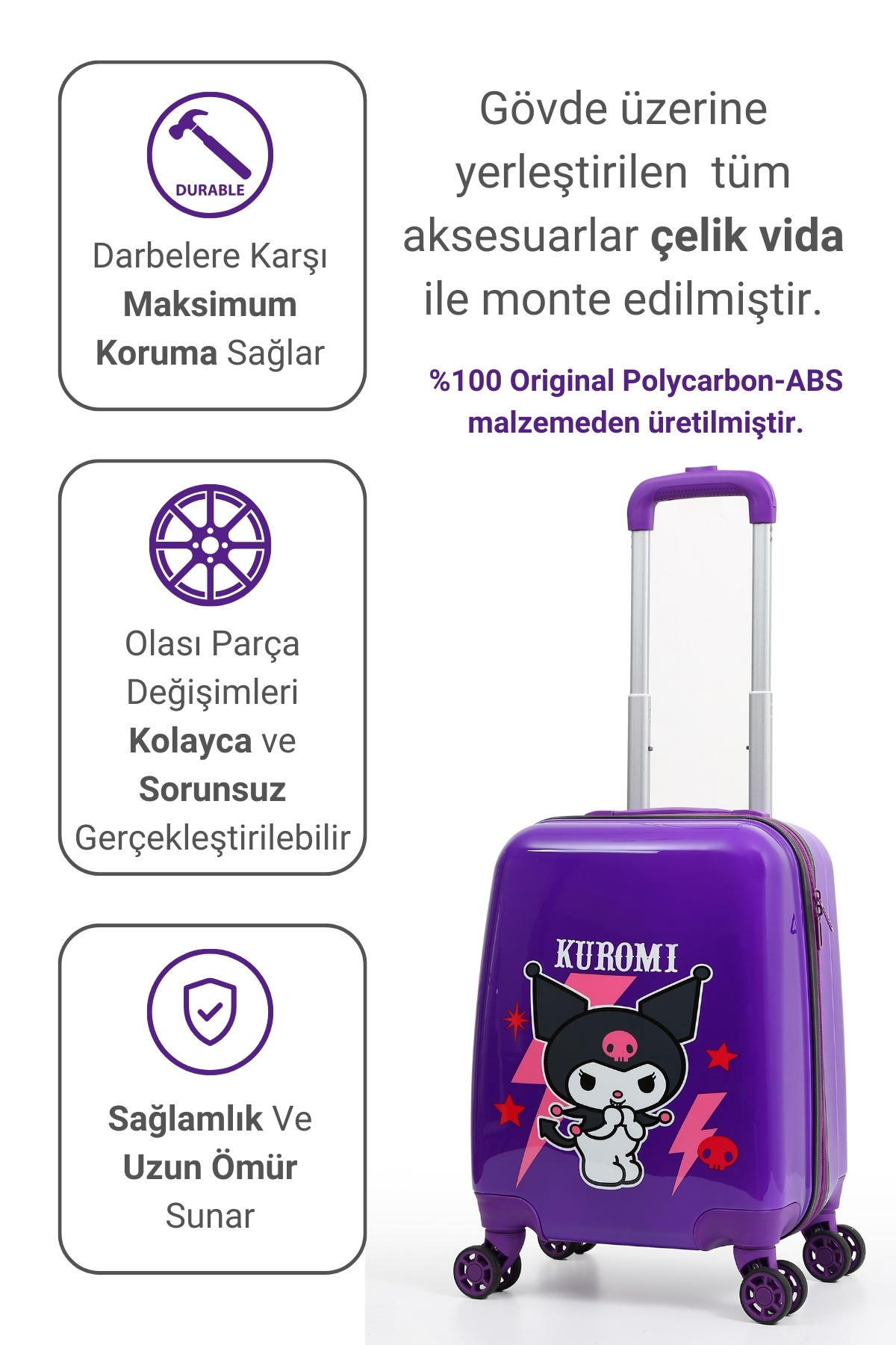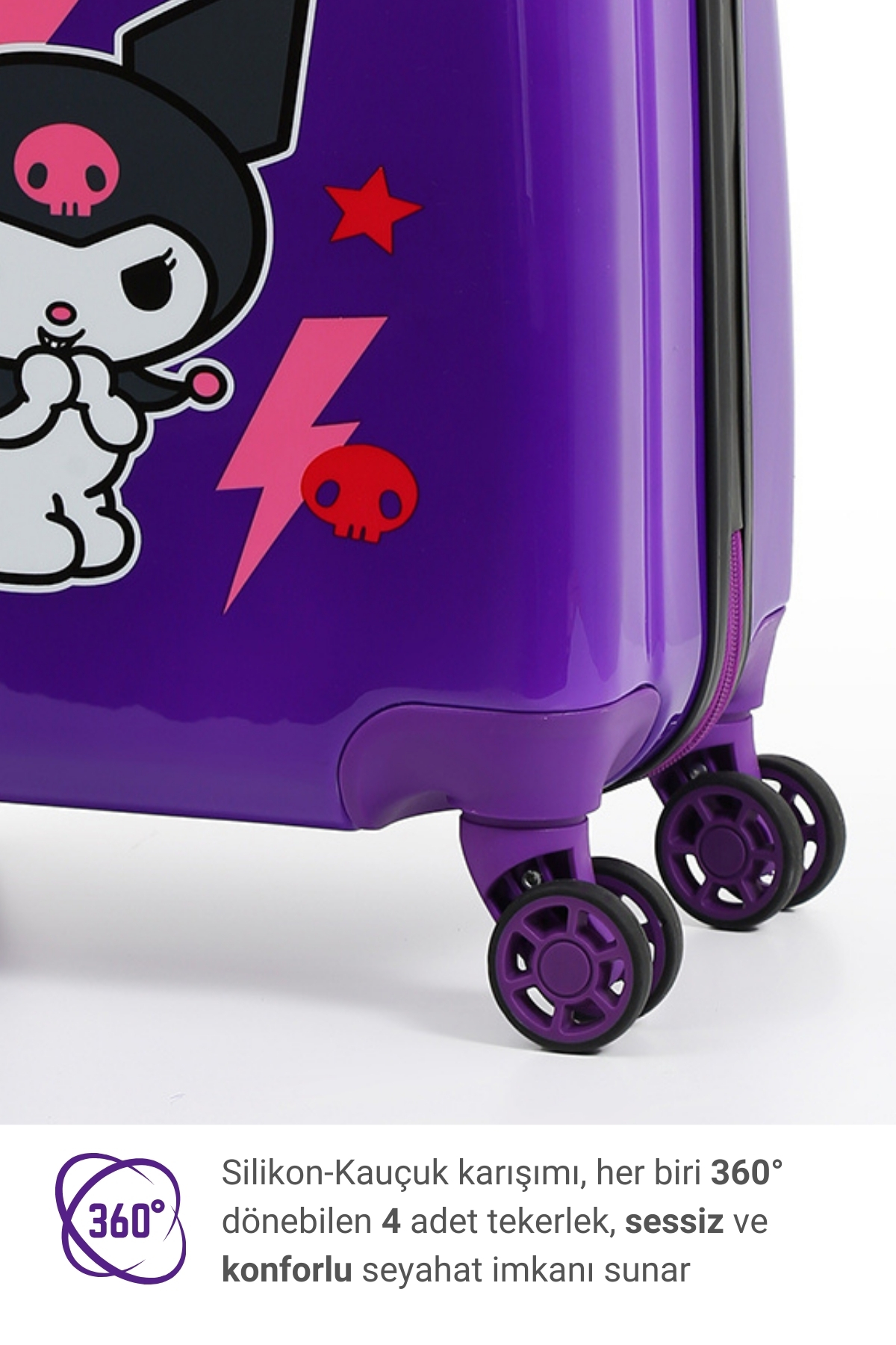 Sanrio’nun asi tatlı karakteri Kuromi ile tasarlanmış %100 orijinal lisanslı mor çocuk valizi! Dayanıklı yapısı, hafif tasarımı ve 360° dönebilen tekerlekleriyle seyahatlerde hem eğlenceli hem konforlu bir deneyim sunar.